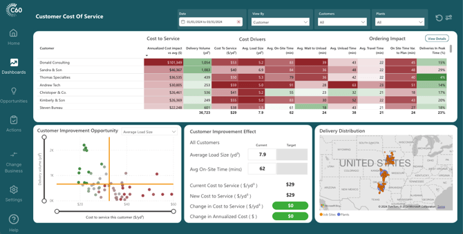 Opportunity value when comparing individual customers or job sites against the average customer or job site. C60 calculates this field by taking the difference in servicing individual customers to the all-customer average then multiplying by the delivered volume in the selected date range followed by annualizing the cost impact.